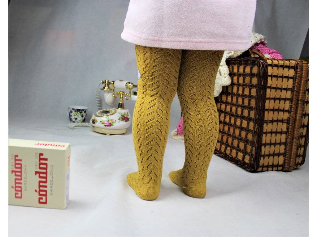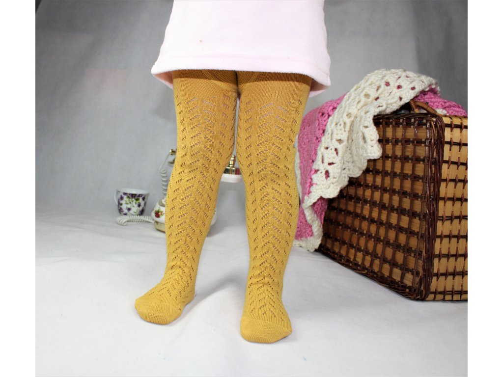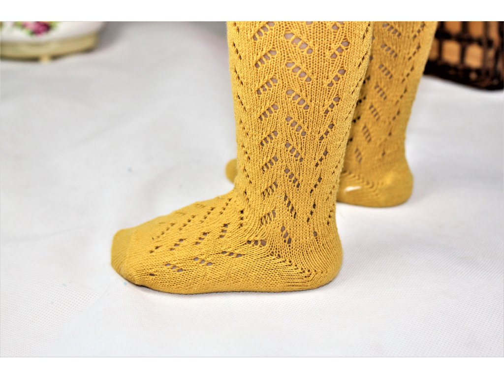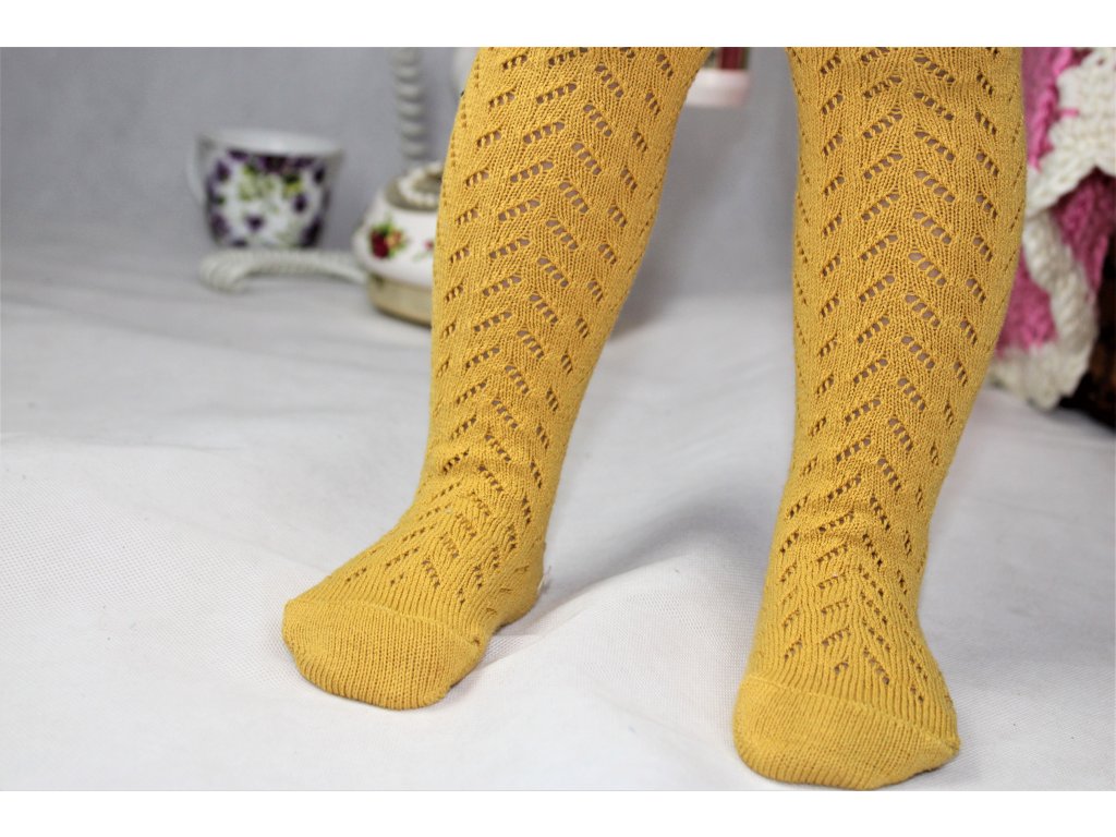 -Krásne a jemné pančuchy s háčkovaným vzorom v horčicovej farbe